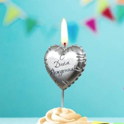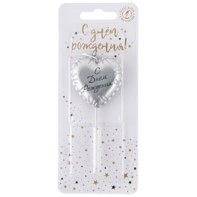 Свеча Сердце, Воздушный шар, на шпажке, Серебро, Металлик, 1 шт.